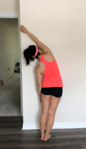 Stand facing the wall. Reach up and over to open up the sideline of your body. Take deep breaths and breathe into the ribcage.